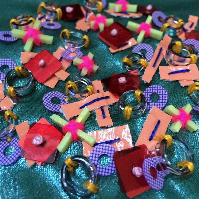 Dew Drops is an abstract embellished design, hand stitched onto a metallic teal base textile. Hand crafted sequin embellishments include dyed tile spacers, packaging sequins, metallic bag ties, wool and printed sequins.