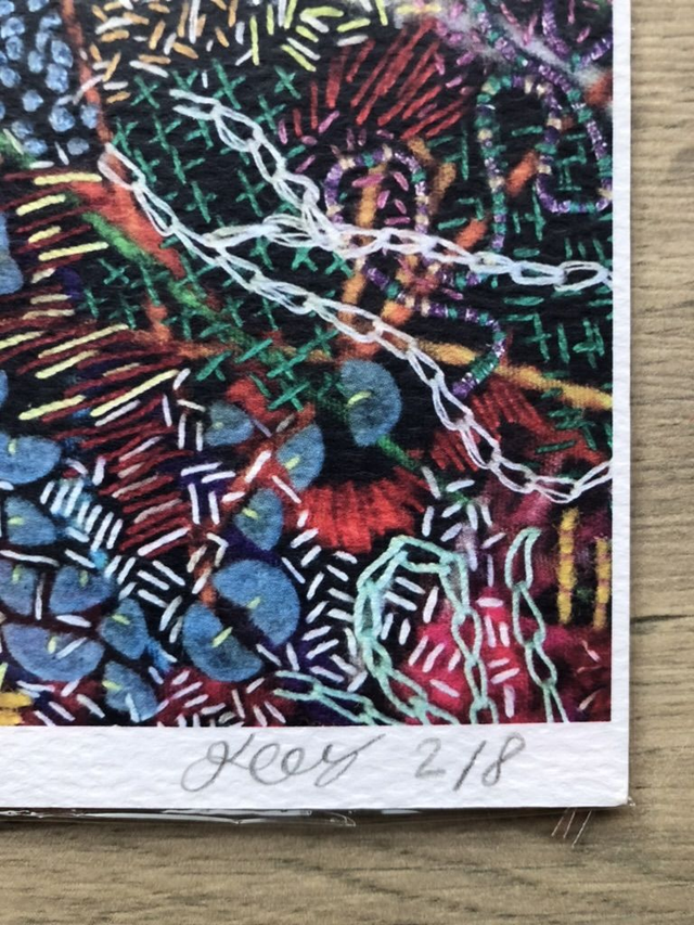 A limited edition of 8 prints of my original Doodle Stitch design. This listing is for one of the 8 prints - printed in the UK on textured card-stock. The finished print quality has a slight dimpled texture and matt, soft colour. Each print is signed, with the edition number visible. Print size including border is approx 46.5cm x 32.5cm. Prints will be shipped flat not rolled. please note this listing is for a digital print - not a physically embroidered textile piece.