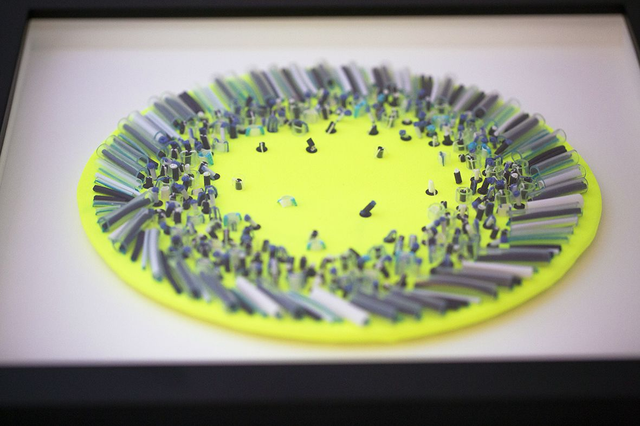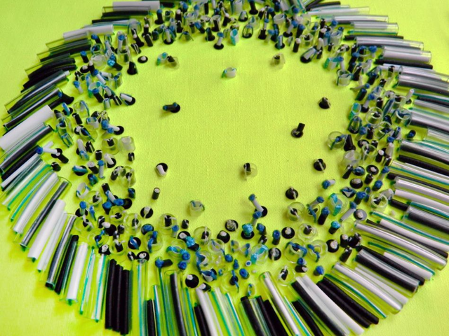 Luminous is a high contrast artwork that uses a limited palette of neon yellow, turquoise black and white to create a zingy, bold design. The embellishments are a combination of handcrafted and recycled elements including; aquarium tubing, electric cable sleeve, cotton bud bugle beads and hand dyed linen thread. The artwork is hand stitched onto a neon yellow cotton base.