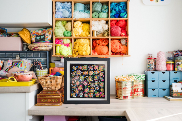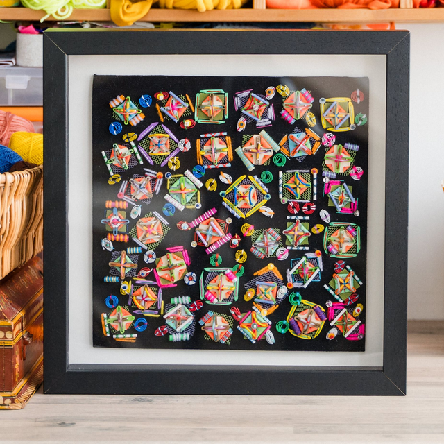 Noughts and Crosses is part of the Encrusted collection, inspired by maximalist, over-embellished and detailed surfaces and intricate patterns using simple shapes. Most pieces in this collection are stitched on dark bases to allow the colours and shapes to really pop.