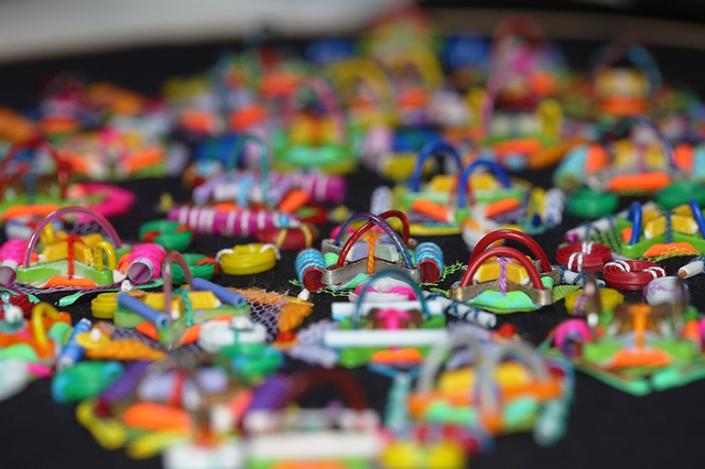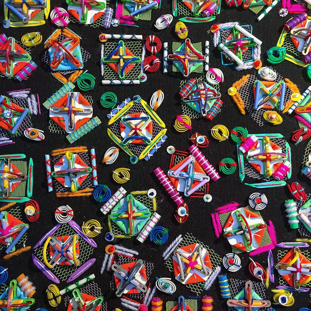 Noughts and Crosses is an abstract artwork with repeating motifs stitched on a black textile base. The embellishments are a combination of handcrafted and recycled elements including; dyed and painted tile spacers, plastic string, gift ribbon, sandwich bag ties, dyed medical tubing, suede sequins, wool and mesh fruit bags.