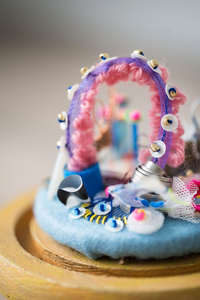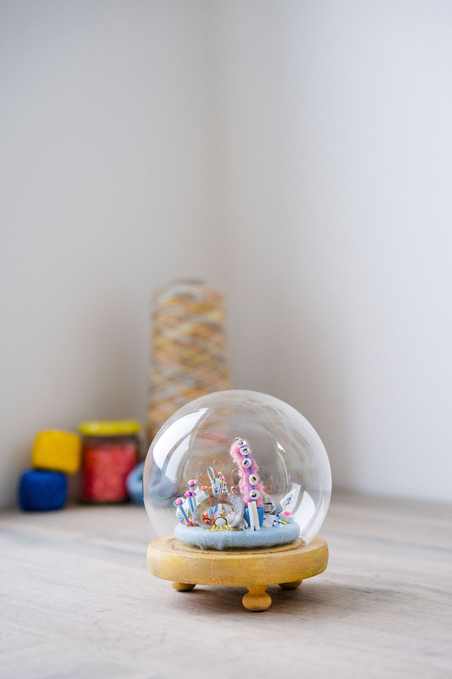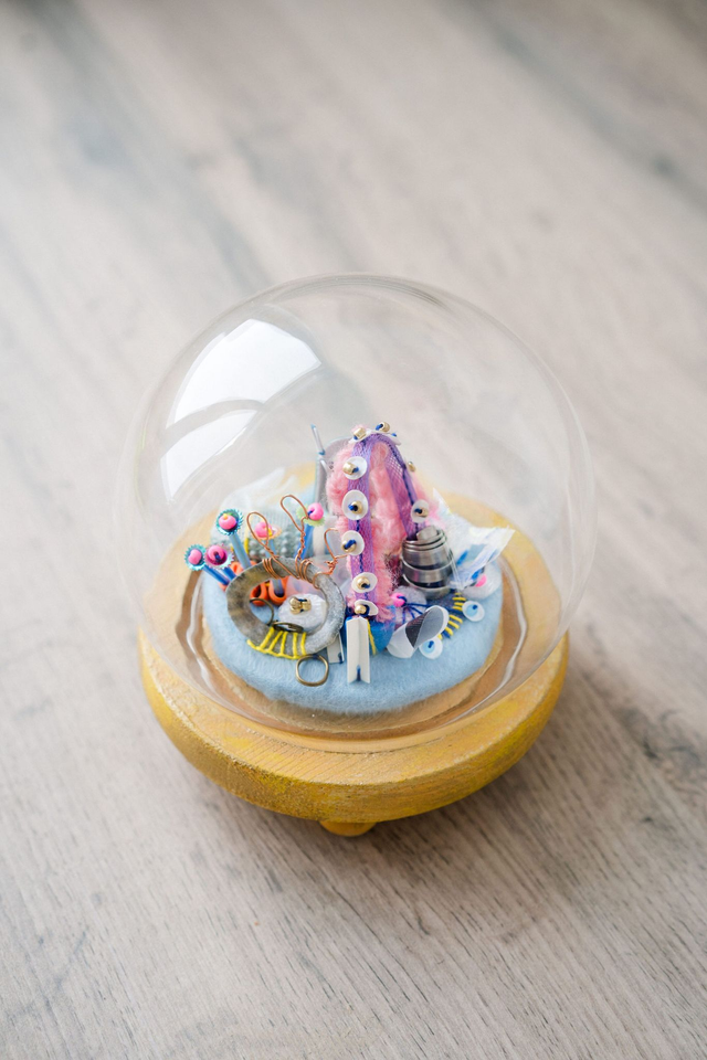 An original hand stitched 3D textile sculpture - displayed in a glass globe bell jar with hand painted wooden base. Created using a combination of recycled materials including: found seashells, metal rings, elastics, wire, punched plastic packaging sequins and beads.