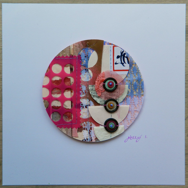 A unique machine and hand stitched collage in shades of pink with black accents - mounted on square white card ready to frame. The stitched collage size is 23cm by 23cm and is signed and numbered. This unique artwork includes offcuts from other projects including sketchbook papers, recycled packaging, industrial washers, and sequins with hand beading details. The artwork comes packaged in bio cellophane.