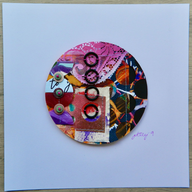 A unique machine and hand stitched collage in shades of pink, orange and black- mounted on square white card ready to frame. The stitched collage size is 23cm by 23cm and is signed and numbered. This unique artwork includes offcuts from other projects including sketchbook papers, printed sequin film waste, washers and sequins with hand beading details. The artwork comes packaged in bio cellophane.